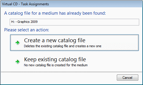 If you attempt to create a catalog for a medium that already has one, an action prompt offers you the choice of creating a second catalog or replacing the existing one. The second option is only advisable for recordable media with contents that change from time to time. If the contents are the same, a second catalog is superfluous.